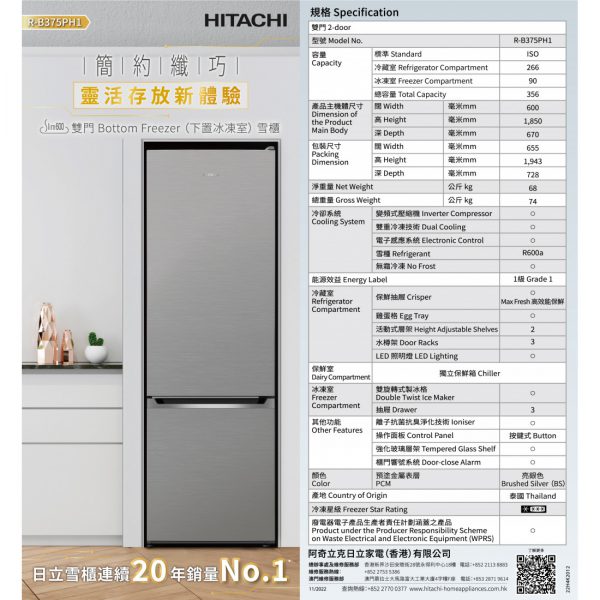 貨號: RB375PH1 分類: 底層冷凍式雪櫃, 雪櫃 標籤: HITACHI 日立 R-B375PH1