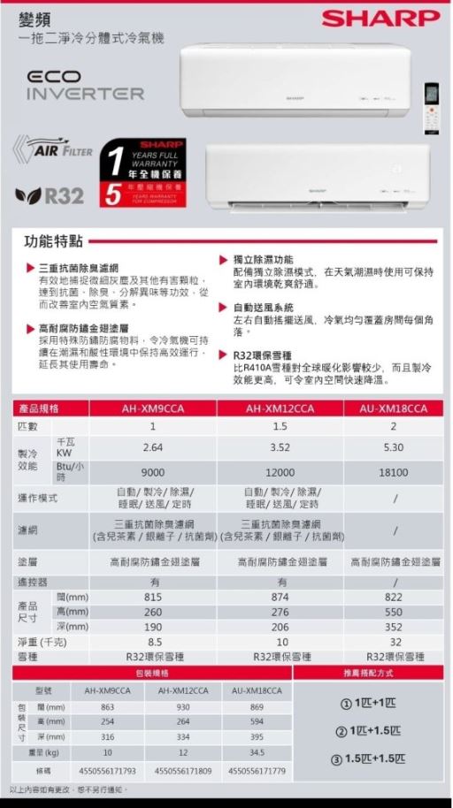 SHARP 一拖二變頻分體R32 AUXM18CCA+ AHXM9CCA X1 ( 1匹 )+ AHXM12CCA X1 (1.5匹 )