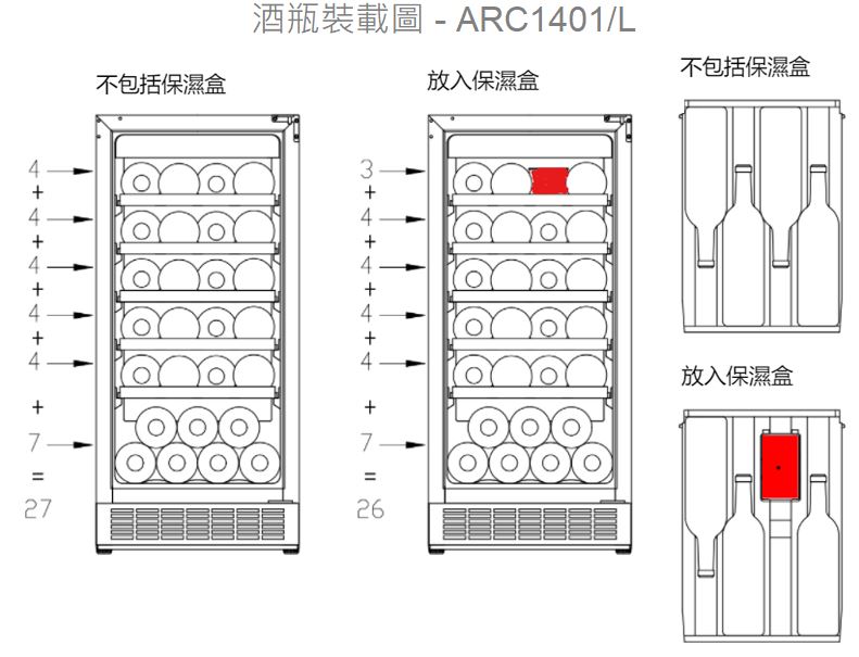 +儲存量以波爾多種類 0.75公升的酒瓶為準,並因應層架數目及擺放方法而異。若附有加濕盒,儲酒量亦會有所影響。