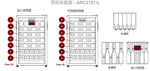 +儲存量以波爾多種類 0.75公升的酒瓶為準,並因應層架數目及擺放方法而異。若附有加濕盒,儲酒量亦會有所影響。